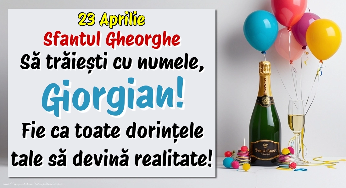 23.Aprilie - Sfantul Gheorghe La mulți ani, Giorgian! Cu ocazia zilei numelui tău, îți trimit cele mai calde urări de bine și de sănătate! Fie ca tot ce îți dorești să devină realitate.