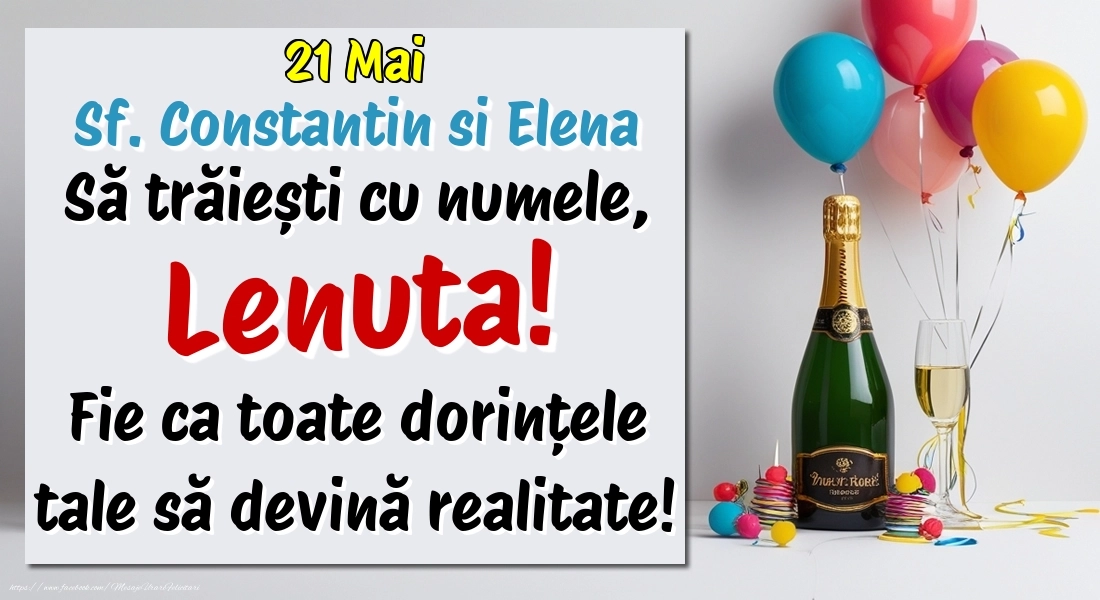21.Mai - Sf. Constantin si Elena La mulți ani, Lenuta! Cu ocazia zilei numelui tău, îți trimit cele mai calde urări de bine și de sănătate! Fie ca tot ce îți dorești să devină realitate.