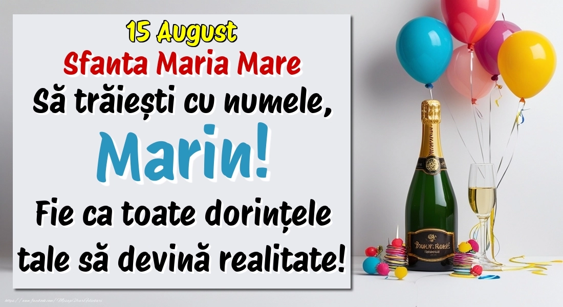 15.August - Sfanta Maria Mare La mulți ani, Marin! Cu ocazia zilei numelui tău, îți trimit cele mai calde urări de bine și de sănătate! Fie ca tot ce îți dorești să devină realitate.
