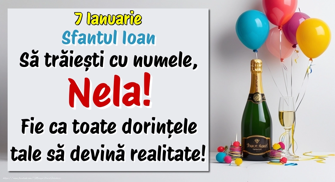 7.Ianuarie - Sfantul Ioan La mulți ani, Nela! Cu ocazia zilei numelui tău, îți trimit cele mai calde urări de bine și de sănătate! Fie ca tot ce îți dorești să devină realitate.