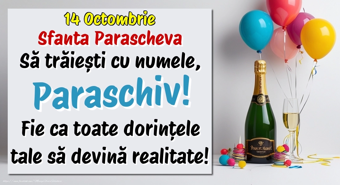14.Octombrie - Sfanta Parascheva La mulți ani, Paraschiv! Cu ocazia zilei numelui tău, îți trimit cele mai calde urări de bine și de sănătate! Fie ca tot ce îți dorești să devină realitate.