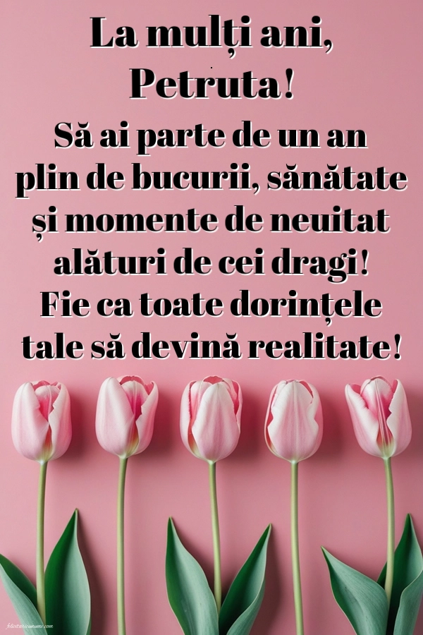 Cu bucurie și entuziasm, vă prezentăm colecția noastră specială de felicitări de la mulți ani, unde numele de fata Petruta este în centrul atenției! Aceste felicitări sunt create cu gândul la a celebra ziua unei persoane dragi, aducând bucurie și urări sincere în fiecare cuvânt. Alege felicitarea care reflectă cel mai bine sentimentele tale și transmite urările tale cele mai sincere pentru o zi de naștere memorabilă! La mulți ani, Petruta!