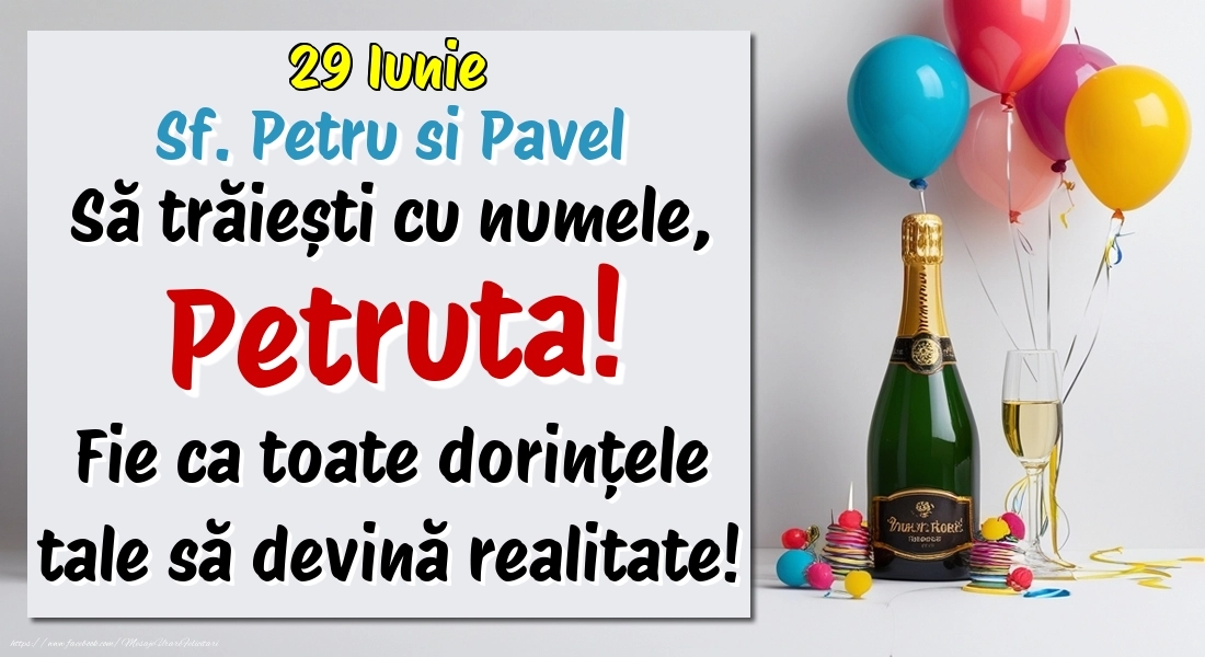 29.Iunie - Sf. Petru si Pavel La mulți ani, Petruta! Cu ocazia zilei numelui tău, îți trimit cele mai calde urări de bine și de sănătate! Fie ca tot ce îți dorești să devină realitate.