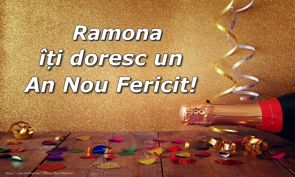 Descoperă colecția noastră de felicitări de Revelion cu numele Ramona, create cu grijă pentru a împărtăși bucurie și optimism în fiecare colț al lumii. În colecția noastră, numele Ramona devine ca o scânteie de veselie în oceanul de bucurie de Revelion. Este o modalitate de a aduce zâmbetul în inima celui care primește această urare de Anul Nou.