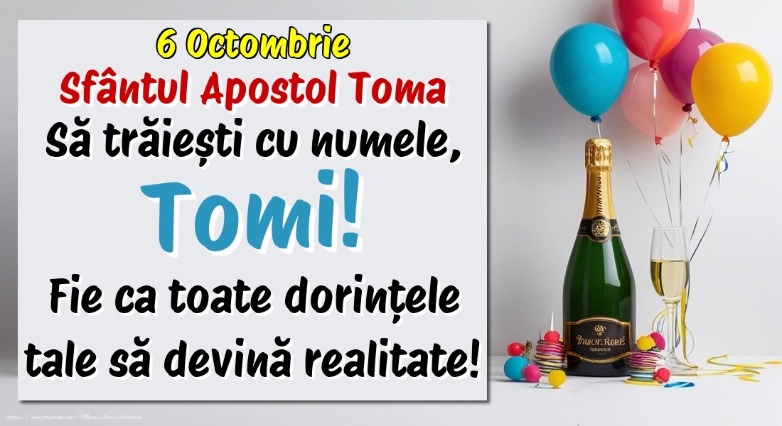6.Octombrie - Sfântul Apostol Toma La mulți ani, Tomi! Cu ocazia zilei numelui tău, îți trimit cele mai calde urări de bine și de sănătate! Fie ca tot ce îți dorești să devină realitate.