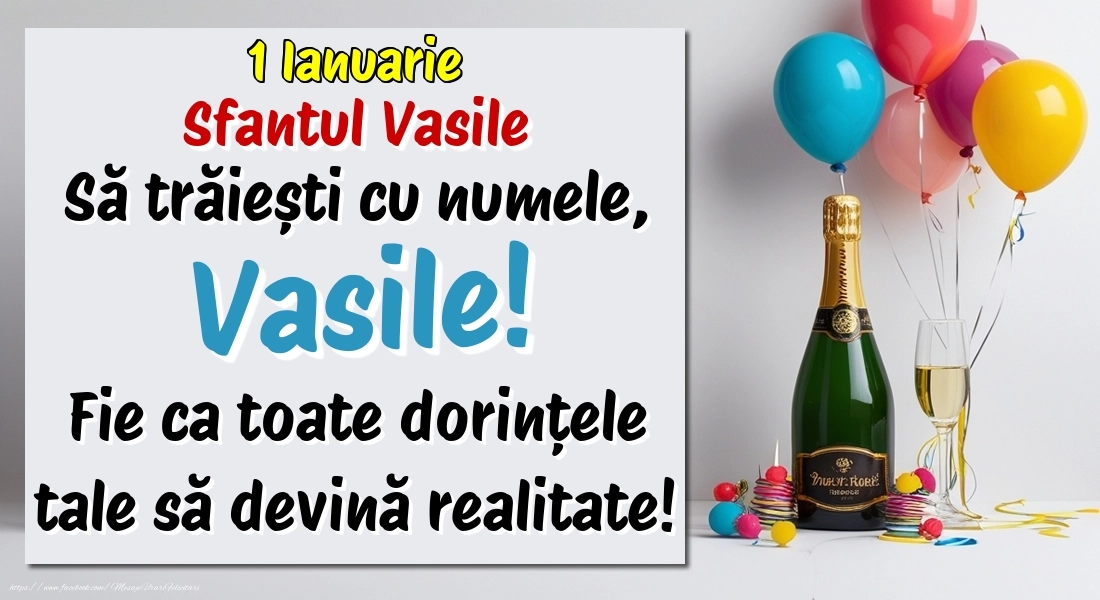 1.Ianuarie - Sfantul Vasile La mulți ani, Vasile! Cu ocazia zilei numelui tău, îți trimit cele mai calde urări de bine și de sănătate! Fie ca tot ce îți dorești să devină realitate.