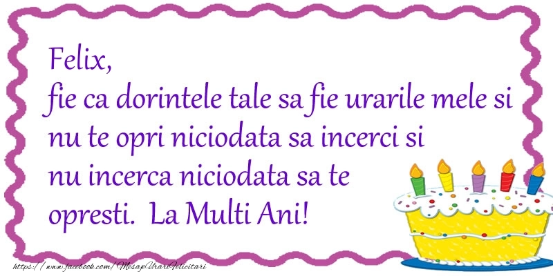Această felicitare cu tort clipart cu lumânări din colecția noastră de felicitari de zi de nastere cu numele Felix are o notă de originalitate și îți oferă ocazia să faci o persoană să se simtă specială datorită faptului că acolo este numele ei. Felicitarea se poate descărca gratuit sau se poate trimite prin Whatsapp, Facebook, Twitter, Pinterest. Imagine de zi de nastere cu tort clipart cu lumânări cu dimensiunile 800px x 400px și cu textul Felix, fie ca dorintele tale sa fie urarile mele si nu te opri niciodata sa incerci si nu incerca niciodata sa te opresti. La Multi Ani!.