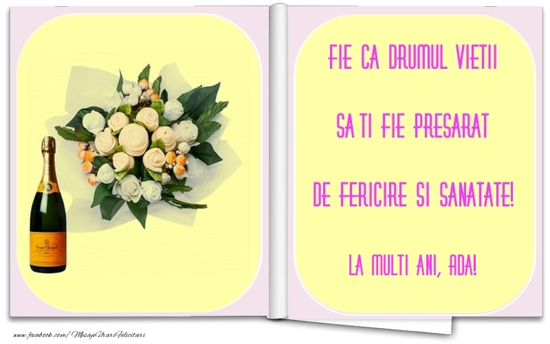 Felicitarea cu flori și șampanie pe fundal tip carte este ca o explozie de bucurie și culoare, iar numele Ada este adăugat cu gingășie pentru a personaliza această experiență de sărbătoare. Este modul tău de a spune la mulți ani într-un mod unic și special!