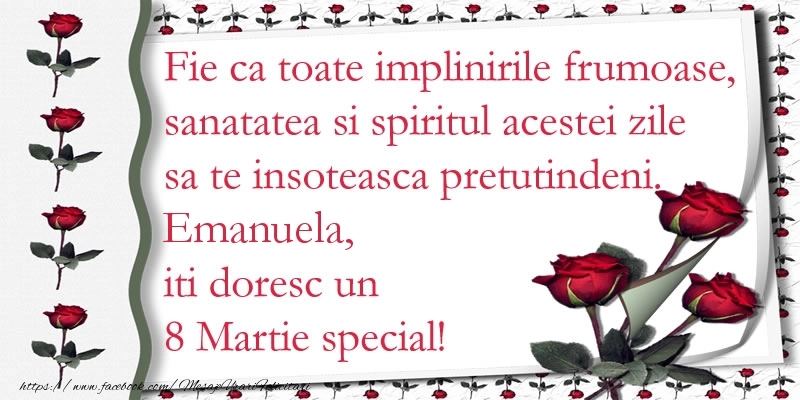 Oferiți mai mult decât un simplu cadou - oferiți o emoție personalizată de Ziua Femeii cu numele Emanuela! Felicitarea de 8 Martie cu trandafiri pentru o persoană specială este menită să încânte și să emoționeze, sărbătorind feminitatea în toată splendoarea sa.
