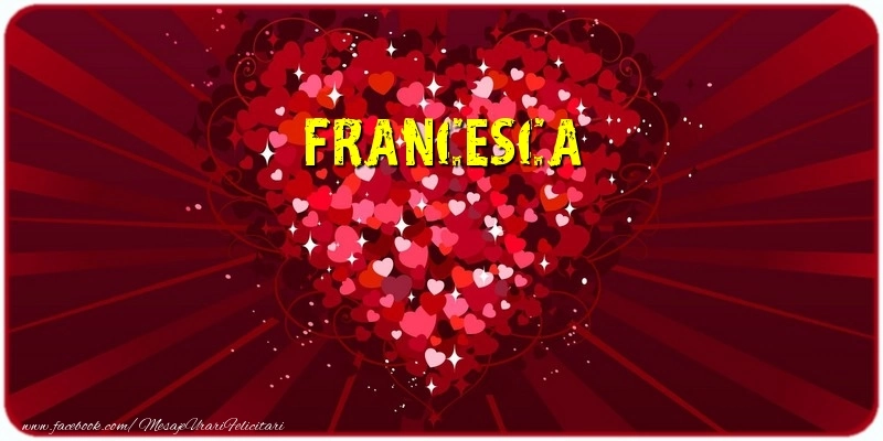 Această felicitare cu inimă facută din mai multe inimioare din colecția noastră de felicitari de dragoste cu numele Francesca are o notă de originalitate și îți oferă ocazia să faci o persoană să se simtă specială datorită faptului că acolo este numele ei. Felicitarea se poate descărca gratuit sau se poate trimite prin Whatsapp, Facebook, Twitter, Pinterest. Imagine de iubire cu inimă facută din mai multe inimioare cu dimensiunile 800px x 400px și cu textul Francesca.