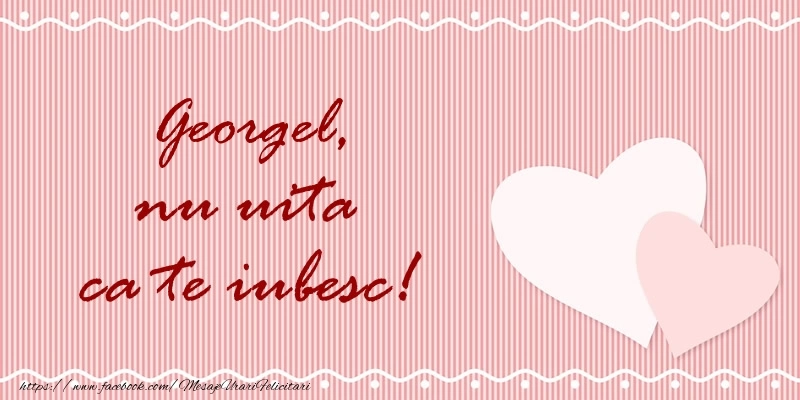 Această felicitare cu inimioare pe fundal roz din colecția noastră de felicitari de dragoste cu numele Georgel are o notă de originalitate și îți oferă ocazia să faci o persoană să se simtă specială datorită faptului că acolo este numele ei. Felicitarea se poate descărca gratuit sau se poate trimite prin Whatsapp, Facebook, Twitter, Pinterest. Imagine de iubire cu inimioare pe fundal roz cu dimensiunile 800px x 400px și cu textul Georgel nu uita ca te iubesc!.