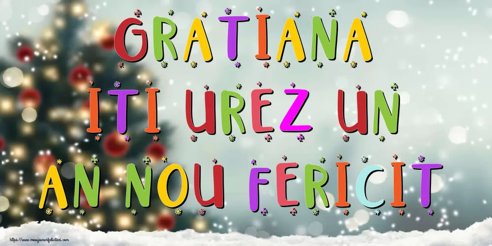 Această felicitare cu brad în peisaj de iarnă din colecția noastră de felicitari de Anul Nou cu numele Gratiana are o notă de originalitate și îți oferă ocazia să faci o persoană să se simtă specială datorită faptului că acolo este numele ei. Felicitarea se poate descărca gratuit sau se poate trimite prin Whatsapp, Facebook, Twitter, Pinterest. Imagine de Anul Nou cu brad în peisaj de iarnă cu dimensiunile 1000px x 500px și cu textul Gratiana, iti urez un An Nou Fericit!.