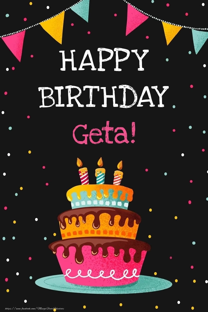 Această felicitare cu tort cu mesaj in engleză Happy Birthday din colecția noastră de felicitari de zi de nastere cu numele Geta are o notă de originalitate și îți oferă ocazia să faci o persoană să se simtă specială datorită faptului că acolo este numele ei. Felicitarea se poate descărca gratuit sau se poate trimite prin Whatsapp, Facebook, Twitter, Pinterest. Imagine de zi de nastere cu tort cu mesaj in engleză Happy Birthday cu dimensiunile 800px x 1200px și cu textul HAPPY BIRTHDAY!.