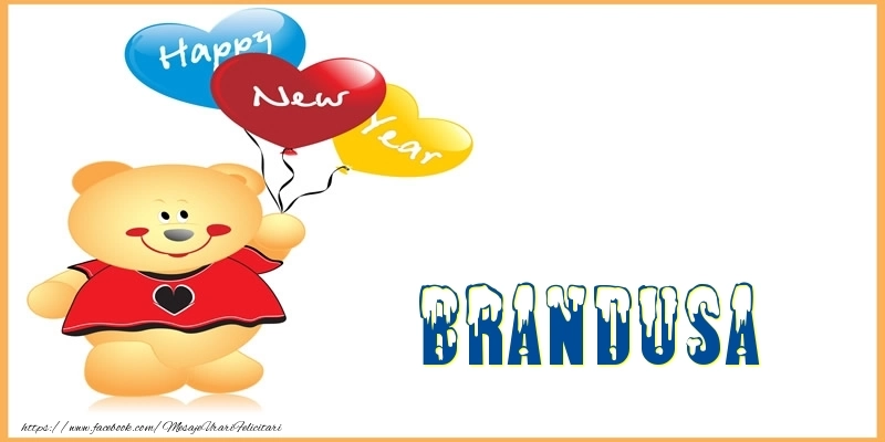 Happy New Year Brandusa! | Felicitare cu ursuleț cu 3 baloane colorate cu Happy New Year | Felicitari de Anul Nou