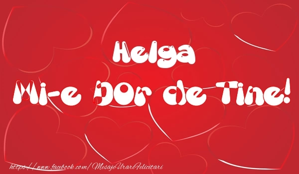Această felicitare cu fundal cu inimioare din colecția noastră de felicitari de dragoste cu numele Helga are o notă de originalitate și îți oferă ocazia să faci o persoană să se simtă specială datorită faptului că acolo este numele ei. Felicitarea se poate descărca gratuit sau se poate trimite prin Whatsapp, Facebook, Twitter, Pinterest. Imagine de iubire cu fundal cu inimioare cu dimensiunile 600px x 350px și cu textul Helga mi-e dor de tine!.