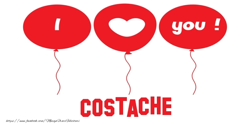 Această felicitare cu I love you in baloane rosii din colecția noastră de felicitari de dragoste cu numele Costache are o notă de originalitate și îți oferă ocazia să faci o persoană să se simtă specială datorită faptului că acolo este numele ei. Felicitarea se poate descărca gratuit sau se poate trimite prin Whatsapp, Facebook, Twitter, Pinterest. Imagine de iubire cu I love you in baloane rosii cu dimensiunile 800px x 400px și cu textul I love you Costache!.