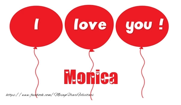 Această felicitare cu I love you scris în baloane din colecția noastră de felicitari de dragoste cu numele Monica are o notă de originalitate și îți oferă ocazia să faci o persoană să se simtă specială datorită faptului că acolo este numele ei. Felicitarea se poate descărca gratuit sau se poate trimite prin Whatsapp, Facebook, Twitter, Pinterest. Imagine de iubire cu I love you scris în baloane cu dimensiunile 600px x 350px și cu textul Monica.