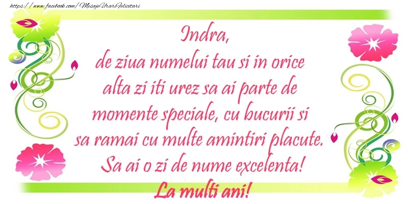 Indra, de ziua numelui tau si in orice alta zi iti urez sa ai parte de momente speciale, cu bucurii si sa ramai cu multe amintiri placute. Sa ai o zi de nume excelenta!