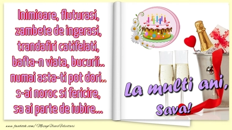 Felicitarea cu șampanie cu pahare pe fundal tip carte este ca o explozie de bucurie și culoare, iar numele Sava este adăugat cu gingășie pentru a personaliza această experiență de sărbătoare. Este modul tău de a spune la mulți ani într-un mod unic și special!