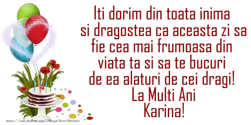 Iti dorim din toata inima si dragostea ca aceasta zi sa fie cea mai frumoasa din viata ta ... La Multi Ani Karina! | Felicitare cu baloane, tort și flori pe fundal alb | Felicitari de la multi ani