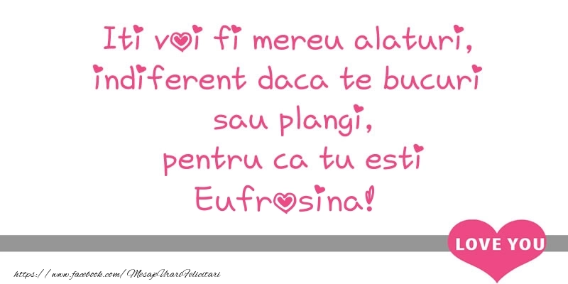 Iti voi fi mereu alaturi, indiferent daca te bucuri  sau plangi, pentru ca tu esti Eufrosina! | Felicitare cu Love you și scris cu inimioare | Felicitari de dragoste