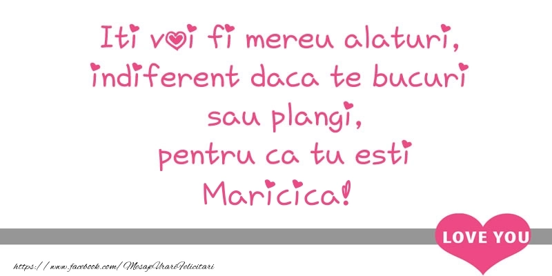 Această felicitare cu Love you și scris cu inimioare din colecția noastră de felicitari de dragoste cu numele Maricica are o notă de originalitate și îți oferă ocazia să faci o persoană să se simtă specială datorită faptului că acolo este numele ei. Felicitarea se poate descărca gratuit sau se poate trimite prin Whatsapp, Facebook, Twitter, Pinterest. Imagine de iubire cu Love you și scris cu inimioare cu dimensiunile 800px x 400px și cu textul Iti voi fi mereu alaturi, indiferent daca te bucuri sau plangi, pentru ca tu esti Maricica!.