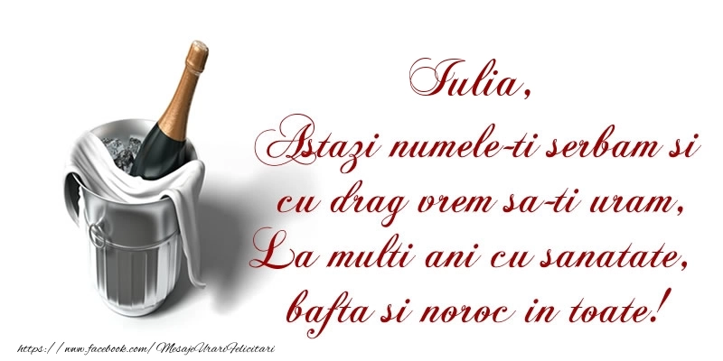 Iulia Astazi numele-ti serbam si cu drag vrem sa-ti uram, La multi ani cu sanatate, bafta si noroc in toate. | Felicitare cu poezie cu sampanie în frapiera | Felicitari de Ziua Numelui
