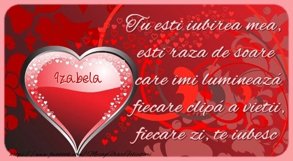 Această felicitare cu inimioare pentru femei sau bărbați din colecția noastră de felicitari de ziua indragostitilor cu numele Izabela are o notă de originalitate și îți oferă ocazia să faci o persoană să se simtă specială datorită faptului că acolo este numele ei. Felicitarea se poate descărca gratuit sau se poate trimite prin Whatsapp, Facebook, Twitter, Pinterest. Imagine de Valentine's day cu inimioare pentru femei sau bărbați cu dimensiunile 600px x 330px și cu textul Izabela Tu esti iubirea mea, esti raza de soare care îmi lumineazá fiecare clipá a vietii, fiecare zi, te iubesc..