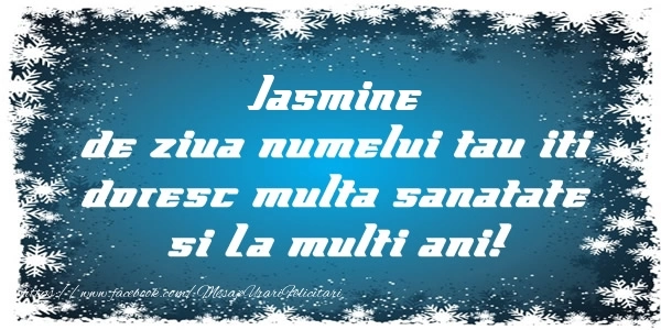 Această felicitare cu un mesaj pe fundal de iarna din colecția noastră de felicitari de la multi ani cu numele Jasmine are o notă de originalitate și îți oferă ocazia să faci o persoană să se simtă specială datorită faptului că acolo este numele ei. Felicitarea se poate descărca gratuit sau se poate trimite prin Whatsapp, Facebook, Twitter, Pinterest. Imagine de la mulți ani cu un mesaj pe fundal de iarna cu dimensiunile 600px x 300px și cu textul Jasmine de ziua numelui tau iti doresc multa sanatate si La multi ani!.