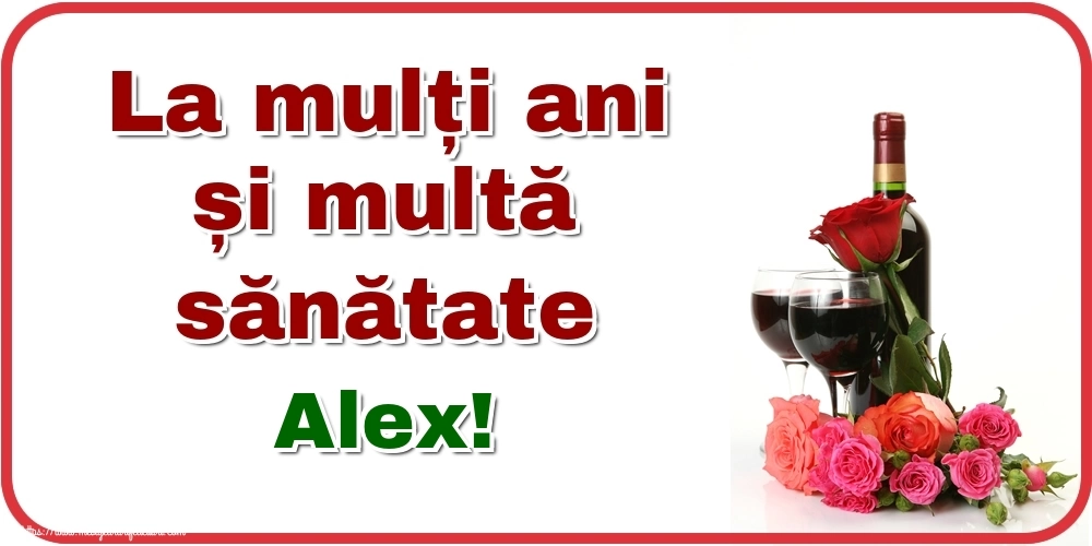 La mulți ani și multă sănătate Alex! | Felicitare cu vin cu pahare și trandafiri | Felicitari de zi de nastere