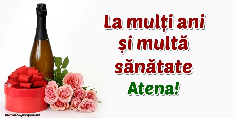 Această felicitare cu trandafiri, șampanie și cadou din colecția noastră de felicitari de zi de nastere cu numele Atena are o notă de originalitate și îți oferă ocazia să faci o persoană să se simtă specială datorită faptului că acolo este numele ei. Felicitarea se poate descărca gratuit sau se poate trimite prin Whatsapp, Facebook, Twitter, Pinterest. Imagine de zi de nastere cu trandafiri, șampanie și cadou cu dimensiunile 1000px x 500px și cu textul La mulți ani și multă sănătate Atena!.