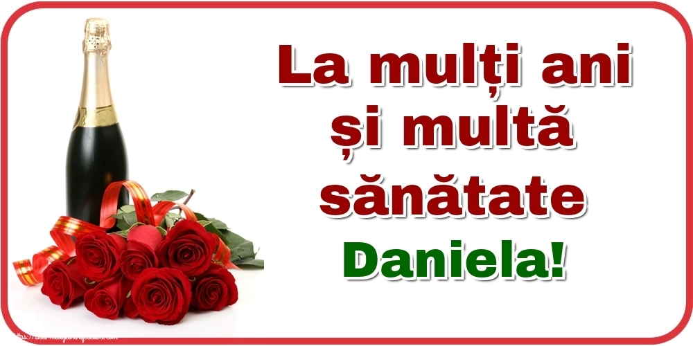 Această felicitare cu șampanie și buchet de trandafiri pe fundal alb din colecția noastră de felicitari de zi de nastere cu numele Daniela are o notă de originalitate și îți oferă ocazia să faci o persoană să se simtă specială datorită faptului că acolo este numele ei. Felicitarea se poate descărca gratuit sau se poate trimite prin Whatsapp, Facebook, Twitter, Pinterest. Imagine de zi de nastere cu șampanie și buchet de trandafiri pe fundal alb cu dimensiunile 1000px x 500px și cu textul La mulți ani și multă sănătate Daniela!.