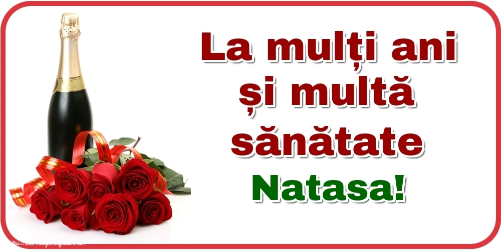 Această felicitare cu șampanie și buchet de trandafiri pe fundal alb din colecția noastră de felicitari de zi de nastere cu numele Natasa are o notă de originalitate și îți oferă ocazia să faci o persoană să se simtă specială datorită faptului că acolo este numele ei. Felicitarea se poate descărca gratuit sau se poate trimite prin Whatsapp, Facebook, Twitter, Pinterest. Imagine de zi de nastere cu șampanie și buchet de trandafiri pe fundal alb cu dimensiunile 1000px x 500px și cu textul La mulți ani și multă sănătate Natasa!.