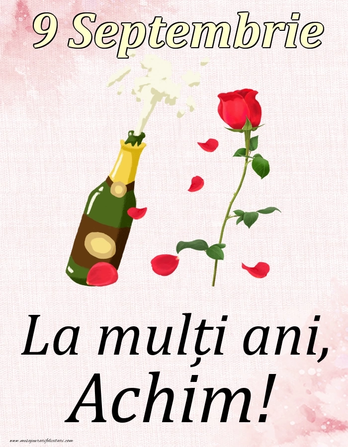 Această felicitare cu șampanie și un trandafir din colecția noastră de felicitari de ziua numelui cu numele Achim are o notă de originalitate și îți oferă ocazia să faci o persoană să se simtă specială datorită faptului că acolo este numele ei. Felicitarea se poate descărca gratuit sau se poate trimite prin Whatsapp, Facebook, Twitter, Pinterest. Imagine de ziua onomastică cu șampanie și un trandafir cu dimensiunile 700px x 900px și cu textul La mulți ani, Achim! - 9 Septembrie.
