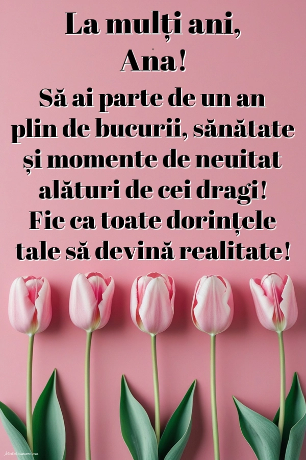 La mulți ani, Ana! Să ai parte de un an plin de bucurii, sănătate și momente de neuitat alături de cei dragi! Fie ca toate dorințele tale să devină realitate! | Felicitare cu lalele roz | Felicitari de la multi ani