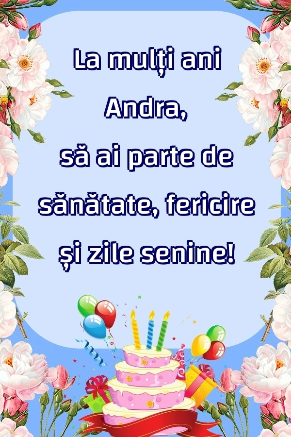 Această felicitare cu tort, flori și baloane colorate din colecția noastră de felicitari de zi de nastere cu numele Andra are o notă de originalitate și îți oferă ocazia să faci o persoană să se simtă specială datorită faptului că acolo este numele ei. Felicitarea se poate descărca gratuit sau se poate trimite prin Whatsapp, Facebook, Twitter, Pinterest. Imagine de zi de nastere cu tort, flori și baloane colorate cu dimensiunile 600px x 900px și cu textul La mulți ani Andra, să ai parte de sănătate, fericire și zile senine!.