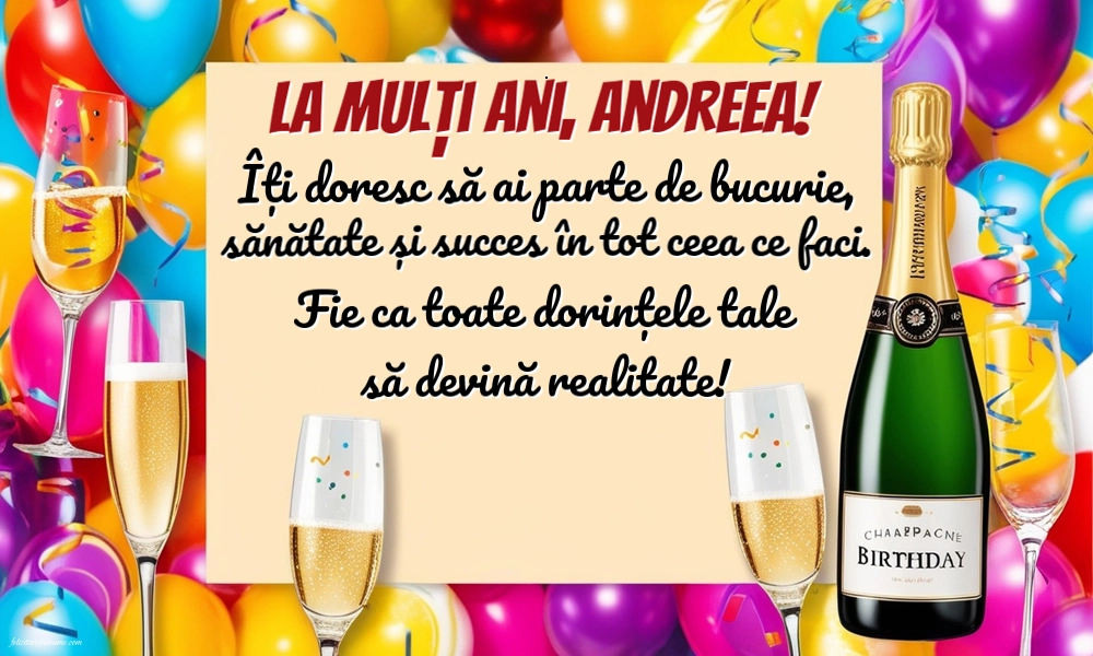 La mulți ani, Andreea! Îți doresc să ai parte de bucurie, sănătate și succes în tot ceea ce faci. Fie ca toate dorințele tale să devină realitate! | Felicitare cu șampanie cu pahare pe fundal cu baloane colorate și confetti | Felicitari de la multi ani