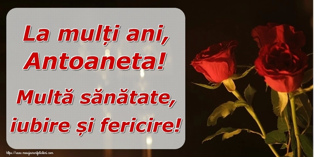 Această felicitare cu 3 trandafiri roșii pe fundal negru din colecția noastră de felicitari de la multi ani cu numele Antoaneta are o notă de originalitate și îți oferă ocazia să faci o persoană să se simtă specială datorită faptului că acolo este numele ei. Felicitarea se poate descărca gratuit sau se poate trimite prin Whatsapp, Facebook, Twitter, Pinterest. Imagine de la mulți ani cu 3 trandafiri roșii pe fundal negru cu dimensiunile 1000px x 500px și cu textul La mulți ani, Antoaneta! Multă sănătate, iubire și fericire!.