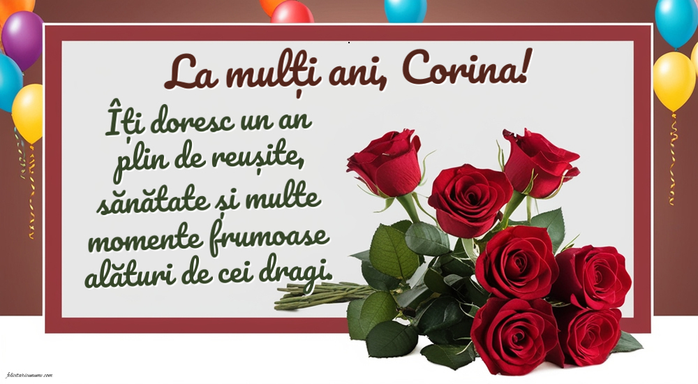 La mulți ani, Corina! Îți doresc un an plin de reușite, sănătate și multe momente frumoase alături de cei dragi. | Felicitare cu 7 trandafiri roșii superbi pe fundal cu baloane | Felicitari de la multi ani