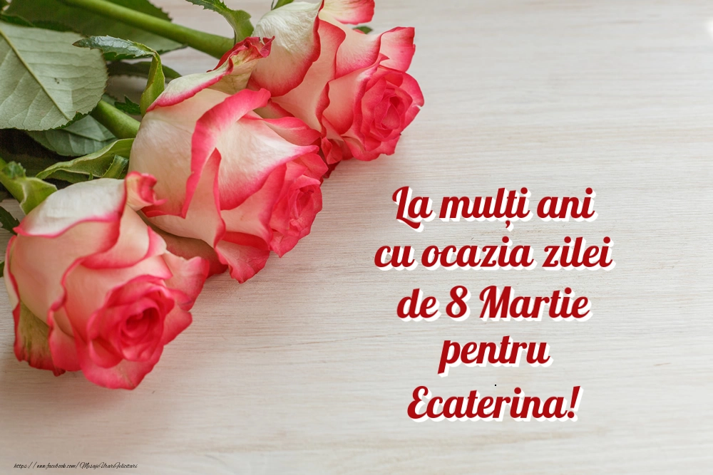 De 8 Martie, celebrează feminitatea, frumusețea și puterea femeilor din viața ta cu felicitarea noastră cu numele Ecaterina, care îți aduce trei trandafiri roz cu alb superbi, simbol al delicateței, iubirii și aprecierii. Această felicitare este mai mult decât un simplu cadou, este o expresie a recunoștinței tale față de femeile puternice și remarcabile din viața ta. Felicitarea se poate descărca gratuit sau se poate trimite prin Whatsapp, Facebook, Twitter, Pinterest. Imagine de Ziua Femeii cu dimensiunile 1000px x 667px și cu textul La mulți ani cu ocazia zilei de 8 Martie pentru Ecaterina!.