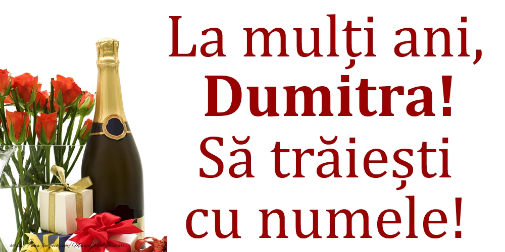La mulți ani, Dumitra! Să trăiești cu numele! | Felicitare cu cadou, flori și șampanie | Felicitari de Ziua Numelui