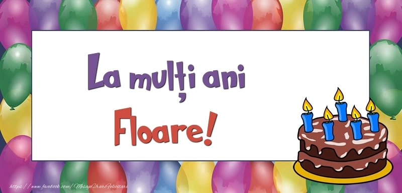 Această felicitare cu desen cu baloane și tort din colecția noastră de felicitari de zi de nastere cu numele Floare are o notă de originalitate și îți oferă ocazia să faci o persoană să se simtă specială datorită faptului că acolo este numele ei. Felicitarea se poate descărca gratuit sau se poate trimite prin Whatsapp, Facebook, Twitter, Pinterest. Imagine de zi de nastere cu desen cu baloane și tort cu dimensiunile 800px x 385px și cu textul La mulți ani, Floare!.