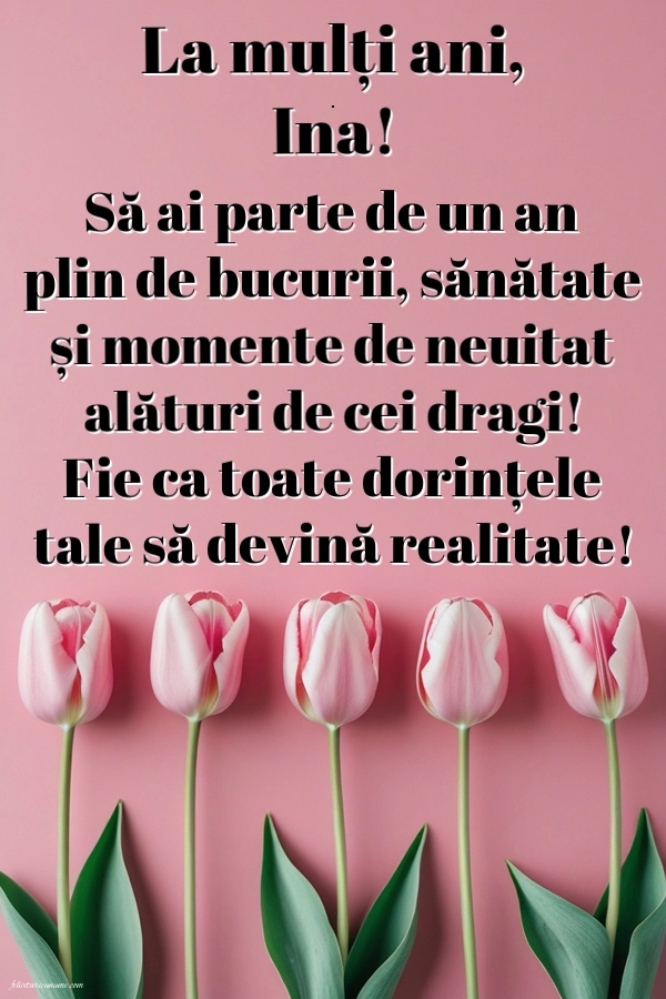 La mulți ani, Ina! Să ai parte de un an plin de bucurii, sănătate și momente de neuitat alături de cei dragi! Fie ca toate dorințele tale să devină realitate! | Felicitare cu lalele roz | Felicitari de la multi ani
