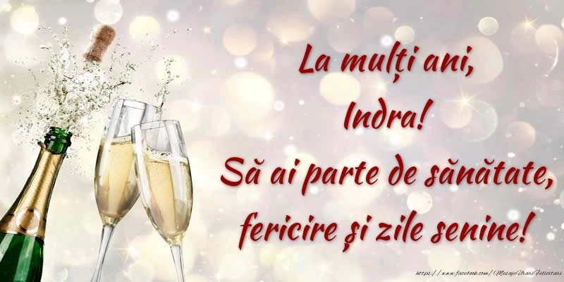 La mulți ani, Indra! Să ai parte de sănătate, fericire și zile senine! | Felicitare cu șampanie și urare de sănătate | Felicitari de zi de nastere