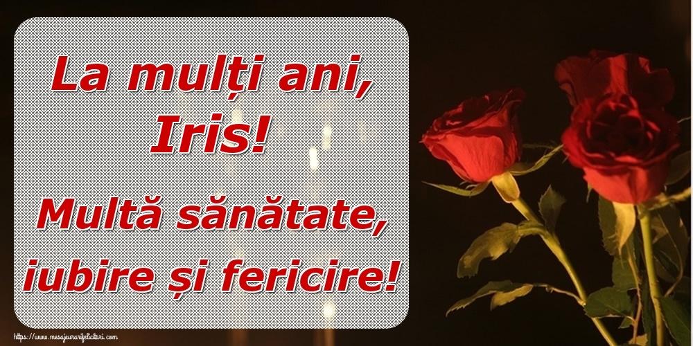La mulți ani, Iris! Multă sănătate, iubire și fericire! | Felicitare cu 3 trandafiri roșii pe fundal negru | Felicitari de la multi ani