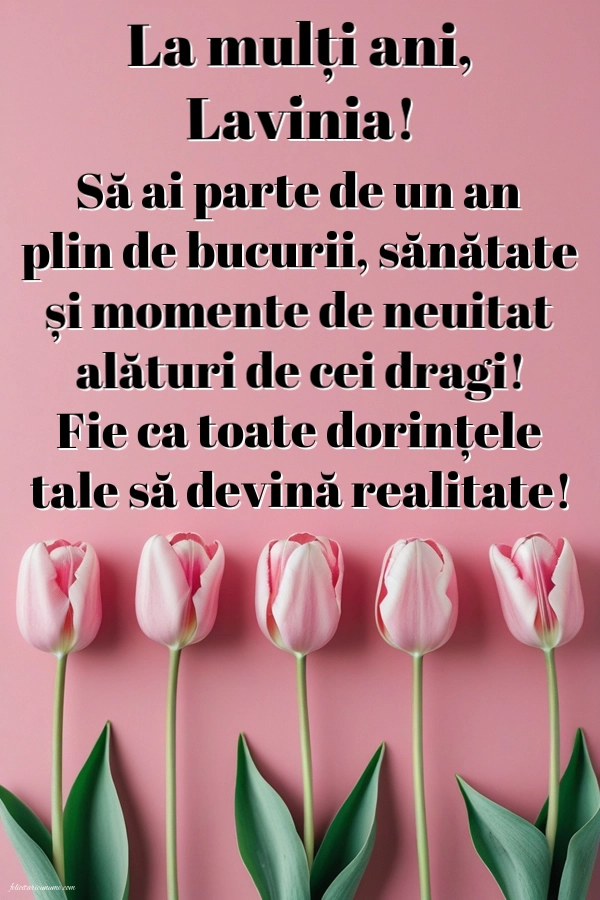 La mulți ani, Lavinia! Să ai parte de un an plin de bucurii, sănătate și momente de neuitat alături de cei dragi! Fie ca toate dorințele tale să devină realitate! | Felicitare cu lalele roz | Felicitari de la multi ani
