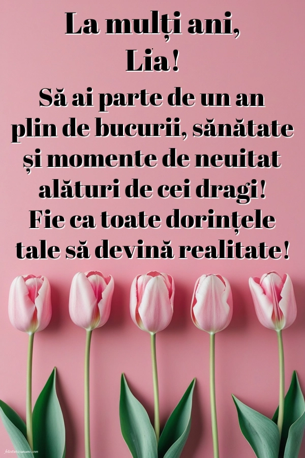 La mulți ani, Lia! Să ai parte de un an plin de bucurii, sănătate și momente de neuitat alături de cei dragi! Fie ca toate dorințele tale să devină realitate! | Felicitare cu lalele roz | Felicitari de la multi ani