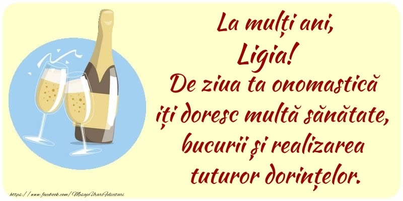La mulți ani, Ligia! De ziua ta onomastică iți doresc multă sănătate, bucurii și realizarea tuturor dorințelor.