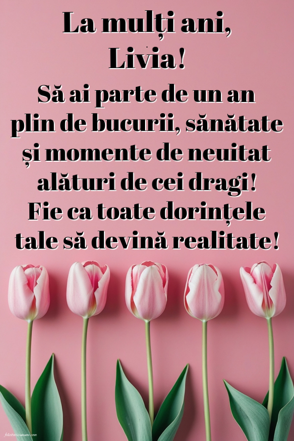 La mulți ani, Livia! Să ai parte de un an plin de bucurii, sănătate și momente de neuitat alături de cei dragi! Fie ca toate dorințele tale să devină realitate! | Felicitare cu lalele roz | Felicitari de la multi ani