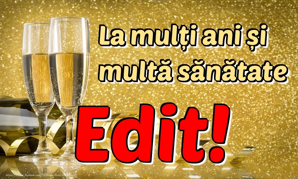 Felicitarea cu șampanie cu pahare pe fundal auriu este ca o explozie de bucurie și culoare, iar numele Edit este adăugat cu gingășie pentru a personaliza această experiență de sărbătoare. Este modul tău de a spune la mulți ani într-un mod unic și special!